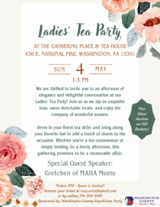 We will be hosting a Ladies’ Tea Party on May 4th with special guest speaker Gretchen of MAHA Moms.